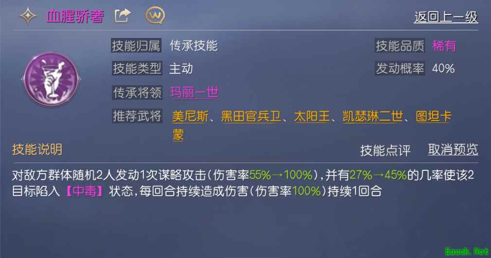 血腥骄奢发动后可对2人分别造成谋略伤害,同时有较高概率施加【中毒】,可带来额外的谋略伤害收益。