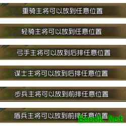 2、每种兵种可以布局的位置不同,简单来说步兵、盾兵只能布置于前两格,弓手、谋士只能布置于后两格,重骑、轻骑可以随意布置于16格内任意位置。