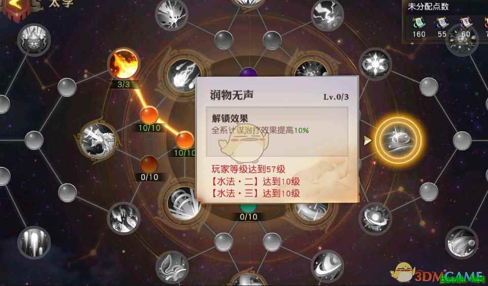 三、星盘的点亮需要符合对应的前置条件方可点亮,例如【润物无声】需要玩家等级达到57级且【水法·二】【水法·三】均达到十级才能提升一级。
