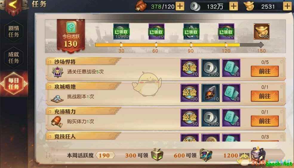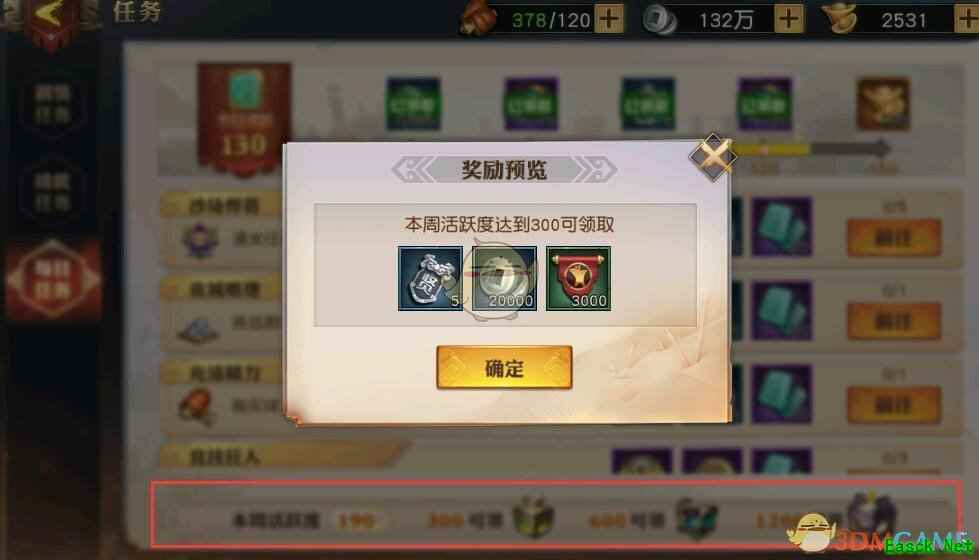 日常任务的奖励主要为银两与经验,部分任务拥有竞技币、军功赠送。达到一定的活跃度可以赠送额外的资源。其中在满足120活跃度时获得的功勋是重要的资源,可以提升自身的爵位来获得非常多的加成。