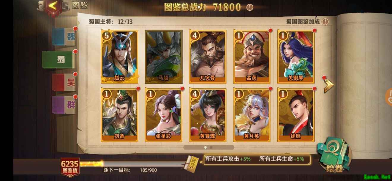 刘备的“匡扶汉室”技能能够增强蜀国主将的攻击,场上一共有5名蜀国主将,因此派上刘备准没错。而且5名主将可以通过刘备的“桃园”技能为其增加10万生命,大幅度提高刘备坦度,能扛能打。