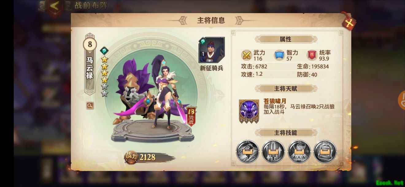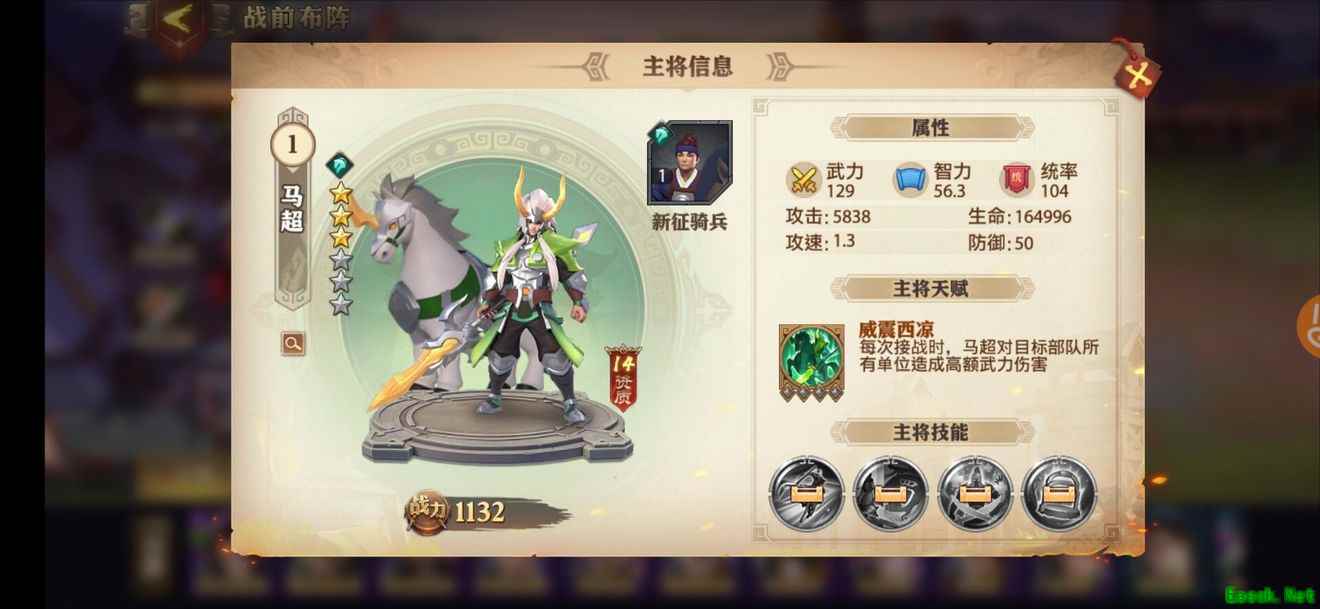马腾的主将天赋“轻骑共主”使得我方所有轻骑部队每次攻击回血,因此极大增强了轻骑部队的生存能力,续航非常给力。而且这个buff是全场性的,轻骑在,天赋在。此外他的“奇袭”技能对远程部队有伤害加成,再加上轻骑兵本身的职业加成,他的核心地位不言而喻。