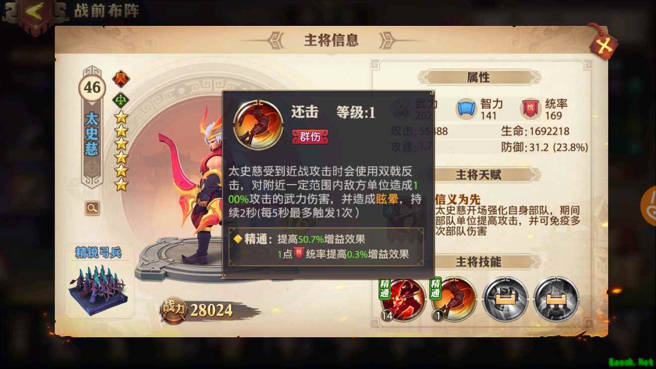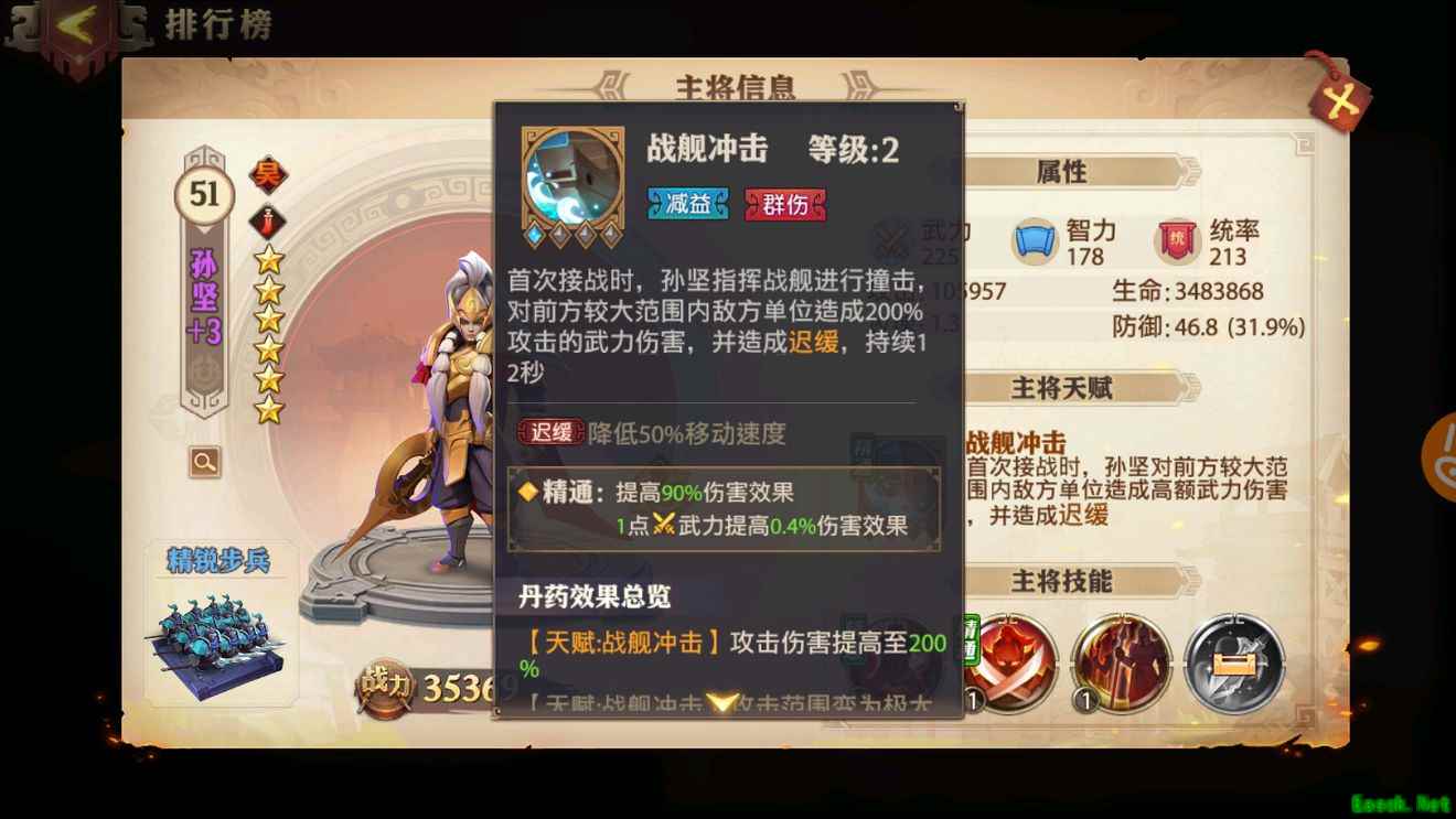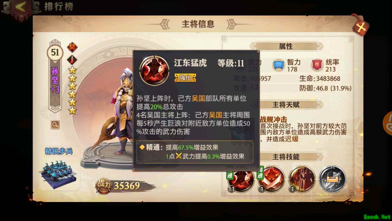 另一个是核心的江东猛虎技能,孙坚上场之后,将会对在场的所有吴国部队单位提升20%的总攻击力,对于整个阵容的强度提升极大,再加上每5秒一次的50%攻击的武力伤害,毫无疑问让整体的输出被进一步拔高。