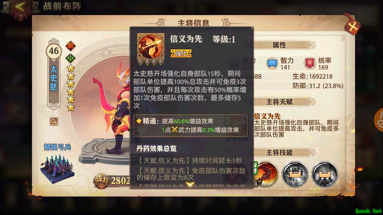在阵容上,这边选择了四吴国弓手作为后排输出,其中最重要的弓手主将就是太史慈,因为它拥有特殊的技能机制,能在对面轻骑或者重骑切入到后排的时候,通过天赋技能信义为先的免疫伤害效果当成一个短暂的承伤角色,再加上其拥有的还击技能,能够提供稳定的控制能力,让他成为了当前版本的最难被对方处理的弓手。