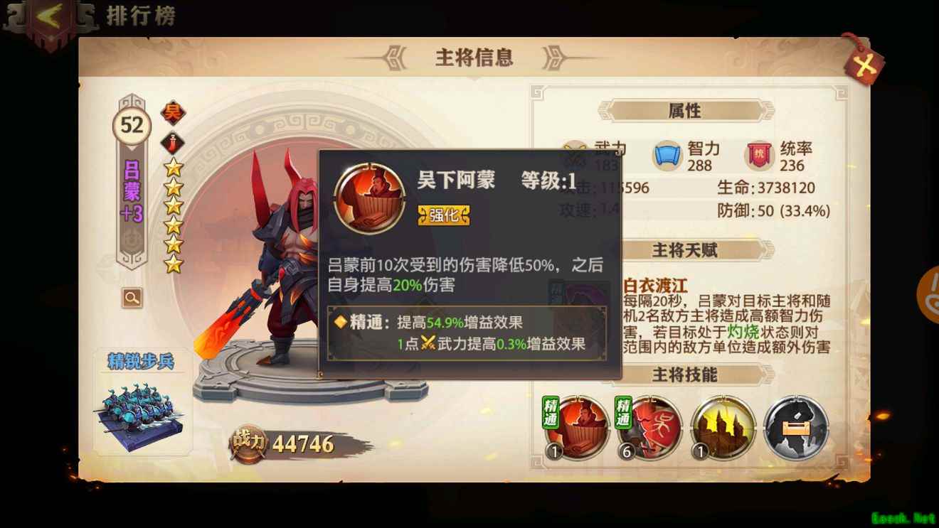 吕蒙天赋技能中针对灼烧敌人产生的范围伤害和吴国弓手依赖的灼烧效果不谋而合,也就是说这个主将能在短时间能最大化的增加输出和提供一定的承伤,是当前阵容中不可或缺的一部分。