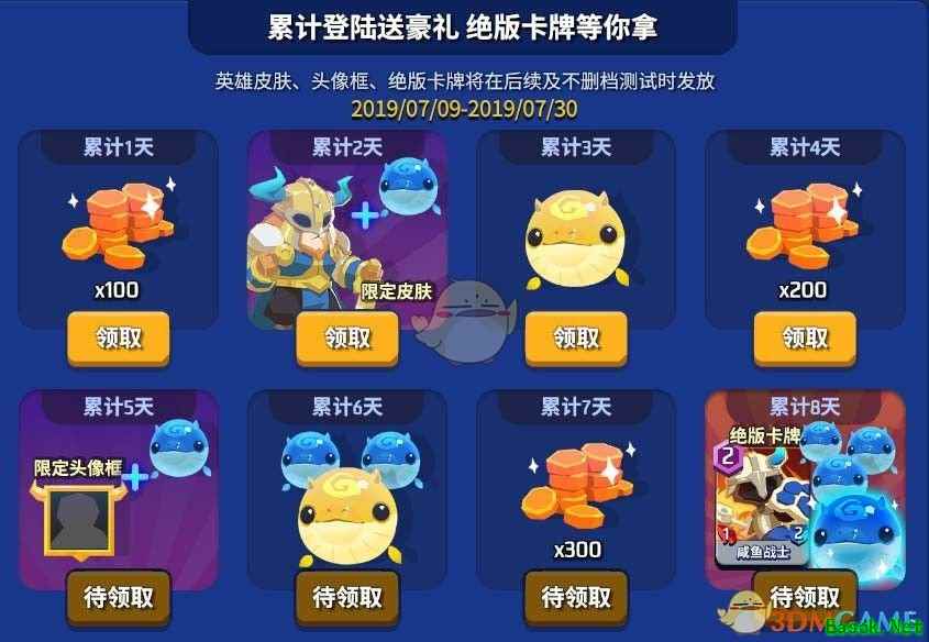 测试期间登录满相应天数,即可领取金币、橙卡、英雄皮肤、头像框、定制版咸鱼战士卡牌等豪华奖励。其中,英雄皮肤、头像框、定制版咸鱼战士卡牌均为本次四皇测试专属绝版奖励,只有参与本次四皇测试,并登录满相应天数的用户才能领取。领取之后,在后续测试和不删档测试中使用当前帐号登录,均会发放此次绝版奖励。