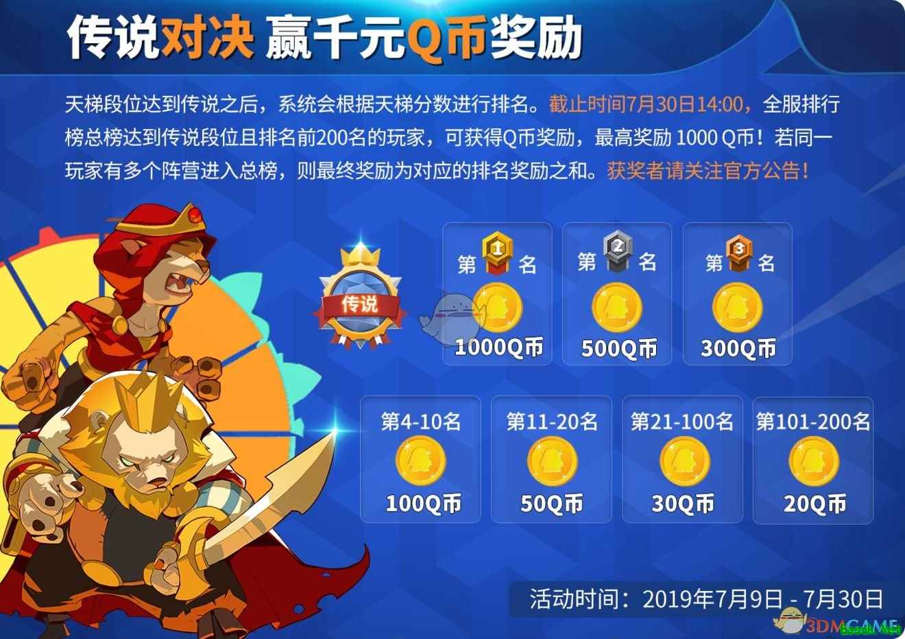 截止时间7月30日14:00,天梯段位达到传说,且排名前200名的玩家,可获得Q币奖励,最高奖励1000Q币。若同一玩家有多个阵营进入总榜,则最终奖励为对应的排名奖励之和。