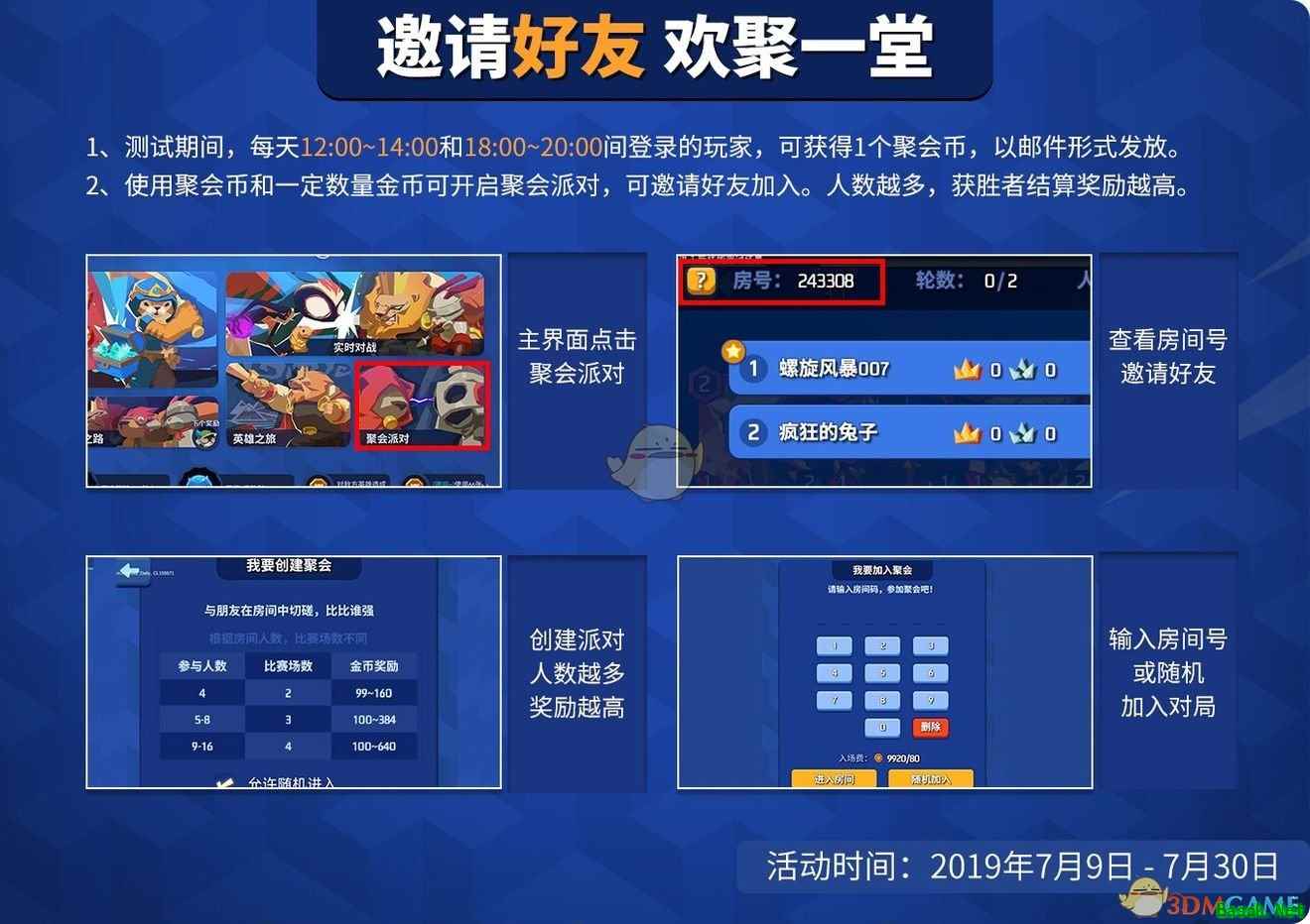 测试期间,每天12:00-14:00和18:00-20:00间登录的玩家,可获得1个聚会币。消耗聚会币和金币可开启聚会派对,可邀请朋友加入,人数越多,获胜者结算奖励越高。
