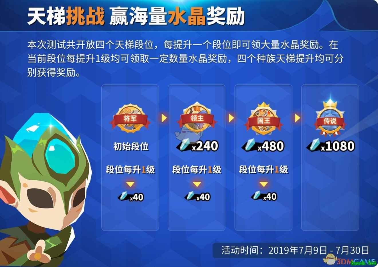 测试期间,每提升1个大段位即可领大量水晶奖励,例如:从初始段位将军提升至领主段位可领取240水晶奖励。在当前段位每提升1级均可领取一定数量水晶奖励。四个种族天梯提升均可分别获得奖励。