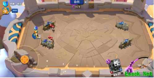 这关我们起始只有3点法力值法力上限也是3点,而我们只有一张咸鱼战队5点法力值,所以我们要拖到法力值上限5点时,有两个咸鱼战士追我们,而我们的4堵0/4的沙筑之墙,我们不能一直遛他们拐弯就会被攻击到,所以我们要利用沙筑之墙可以把他们分到2个墙上,也可以让他们攻击1个墙,最后法力值都能到达5点。