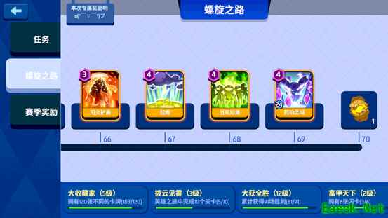 1、螺旋之路是玩家的收集奖励的主要玩法之一,完成螺旋之路的任务可获取大量卡牌并解锁英雄。
