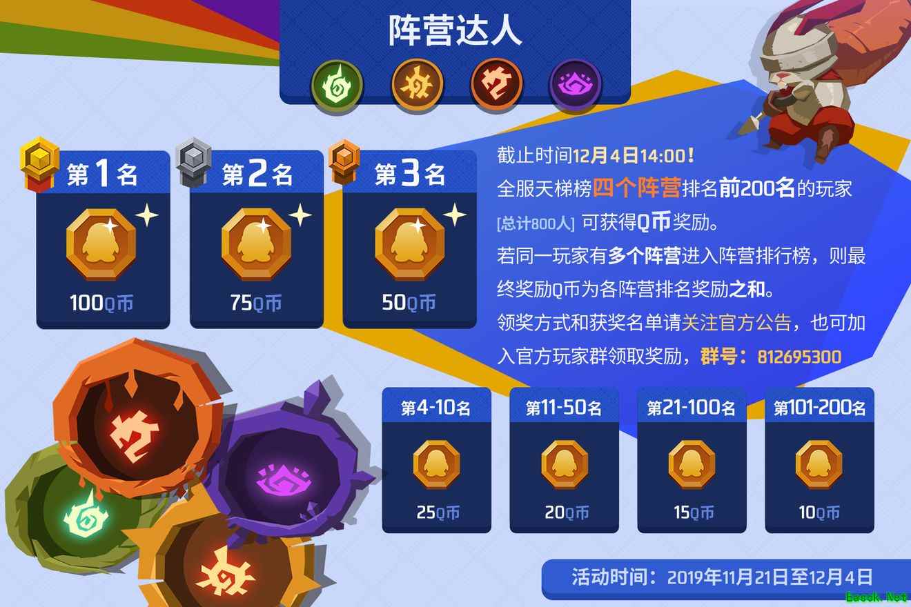 截止时间12月4日14:00,全服天梯榜四个阵营排名前200名的玩家,共计800名玩家,可获得Q币奖励,若同一玩家有多个阵营进入阵营排行榜,则最终奖励Q币为各阵营排名奖励之和。