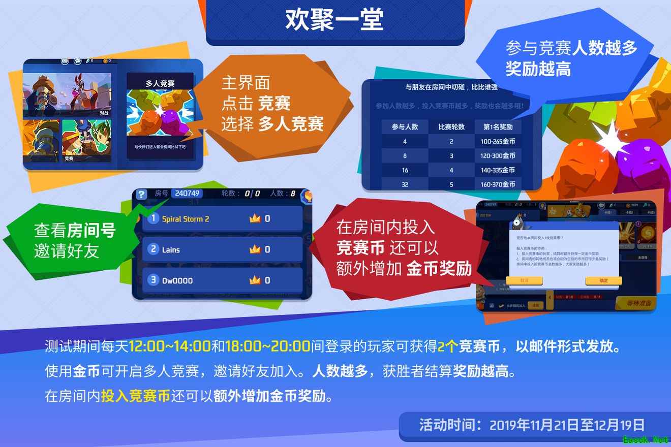 测试期间,每天12:00-14:00和18:00-20:00间登录的玩家,可获得2个竞赛币。使用金币可开启多人竞赛,可邀请朋友加入,人数越多,获胜者结算奖励越高,另外在房间内投入竞赛币还可以额外增加金币奖励。