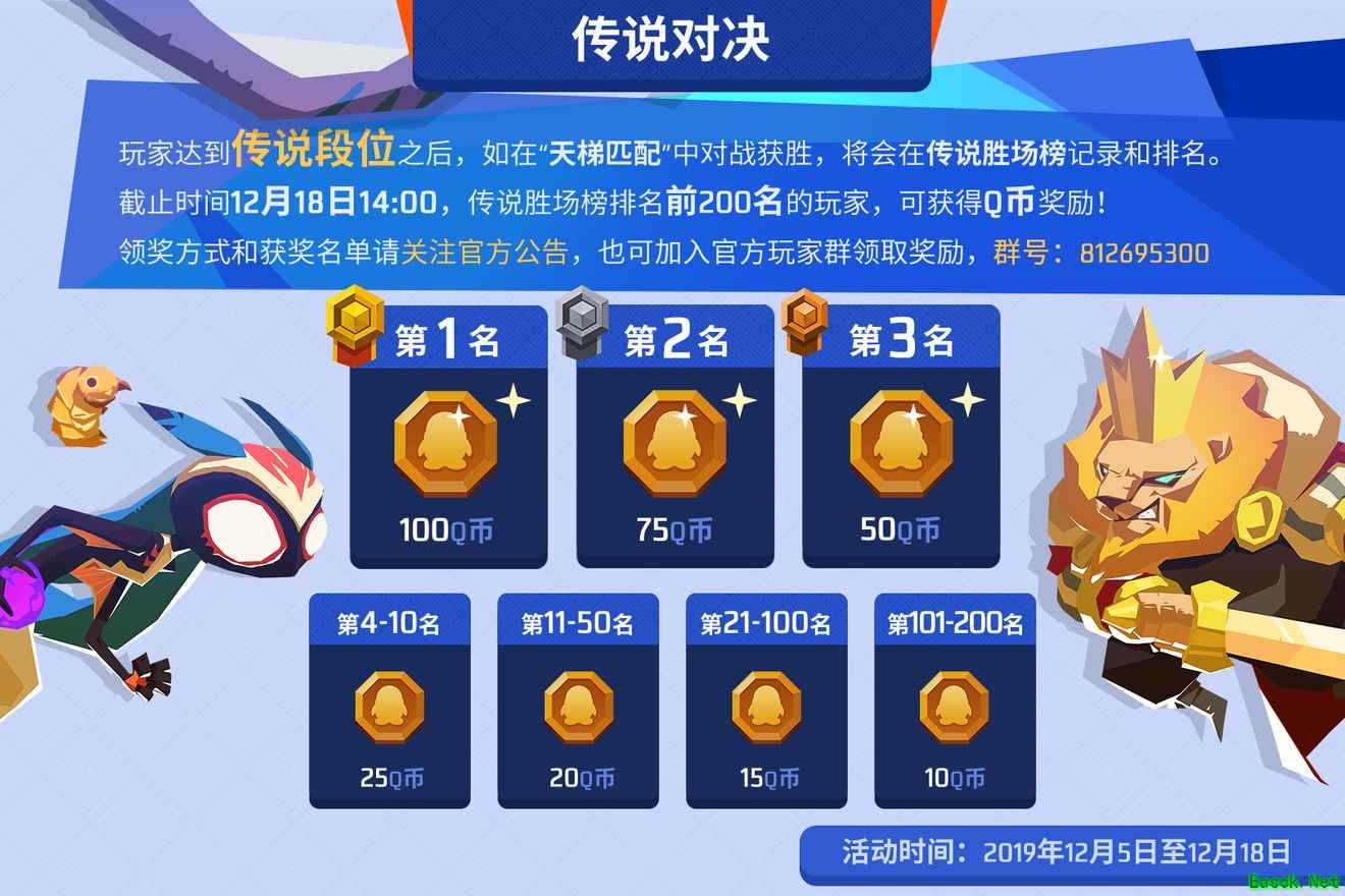 12月4日将会结算第一赛季奖励,从12月5日开始第二赛季,玩家达到传说段位之后,如在“天梯匹配”中对战获胜,将会在传说胜场榜记录和排名。截止时间12月18日14:00,传说胜场榜排名前200名的玩家,可获得Q币奖励!