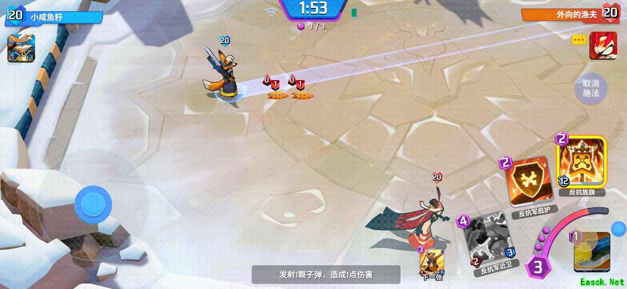 英雄技能“射击”是消耗一费的非指向性技能,发射一颗子弹命中后造成一点伤害,效果表现上等于是永久在手的1费1伤害火球术,可被预判弹道走位与障碍物阻挡。