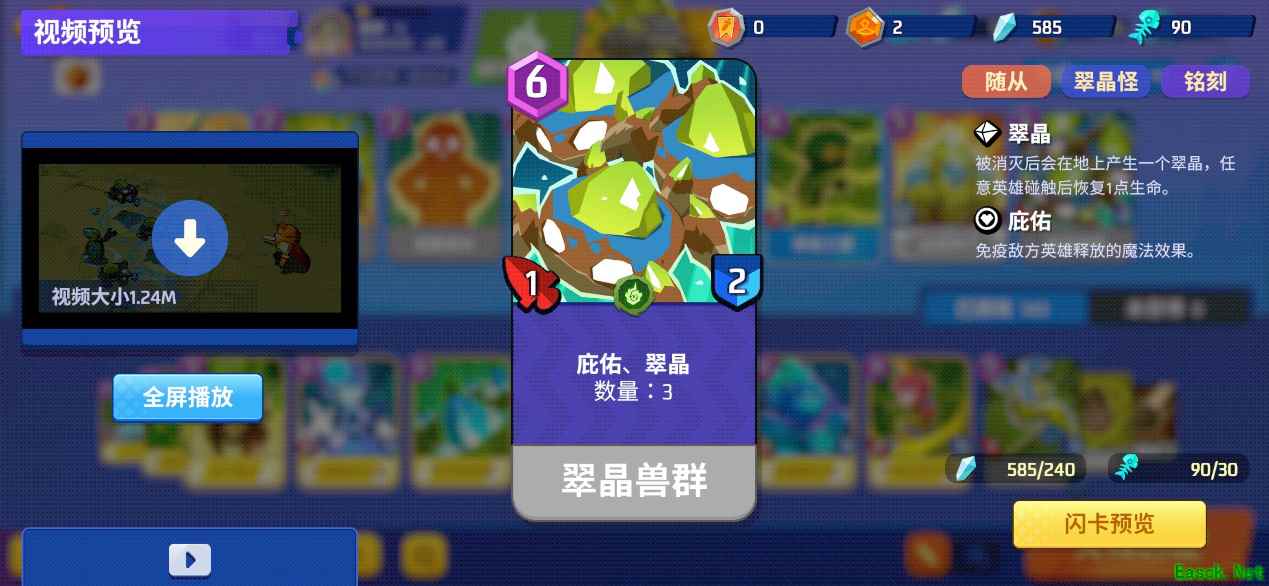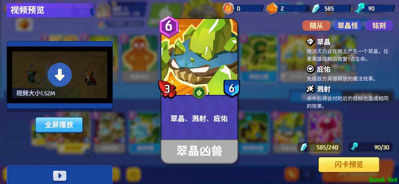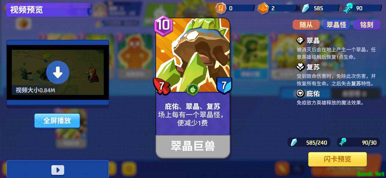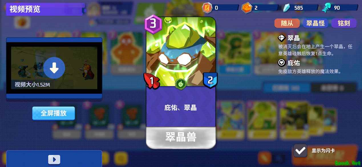 「翠晶兽」的热启动费用为3、铺场费用为6,节奏很亏,而且身板只有1-2。打低费快攻随从时非常不适合单个裸放,换费血亏,进阶版的翠晶凶兽和翠晶巨兽同样有这个毛病。