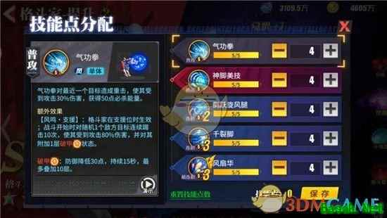 春丽作为输出的主力,加点的思路是如何伤害最大化,前期养成度不高时,可以选择加连招2和被动技,实战中无论暴击与否都能为春丽提供额外效果;而到了中后期养成度较高之后,可以选择主加春丽的超连招,提高爆发能力,并且春丽的被动技能恢复能量配合超连招的恢复能量,如果全队速度较快的话,几乎可以不断的释放技能。