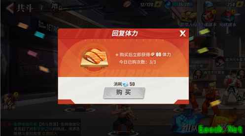 点击体力旁边的加号,花费50钻石可以购买60点体力,每日限购3次。