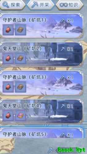 【开采】与【知识】主要获取资源分别为“武器强化(陨铁石)、进阶材料(武器圣典)”与“经验书”,分别消耗的是“开采点”与“知识点”,与【探索】相同【开采】和【知识】也有概率获得宝藏。但与之不同的是“开采点”与“知识点”的回复是以天为周期,每天回复五点。