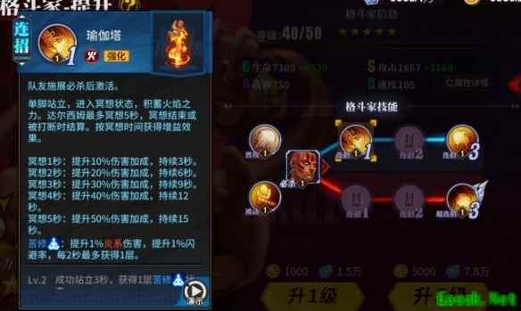 解析:当技能等级提升后,其每次造成伤害也有概率获得苦修效果,并提升苦修状态的累计层数和持续时间,在战斗中稳定提升其攻击和生存能力。