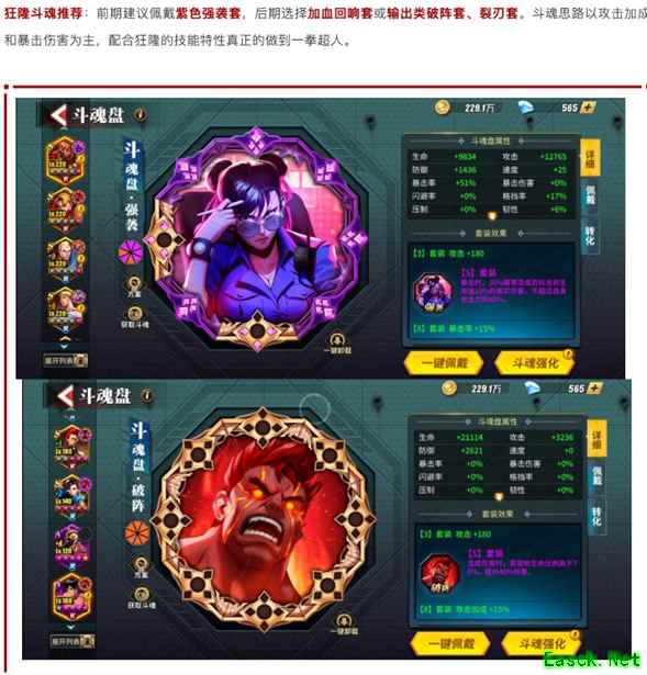 前期建议佩戴紫色强袭套,后期选择加血回响套或输出类破阵套、裂刃套。斗魂思路以攻击加成和暴击伤害为主,配合狂隆的技能特性真正的做到一拳超人。