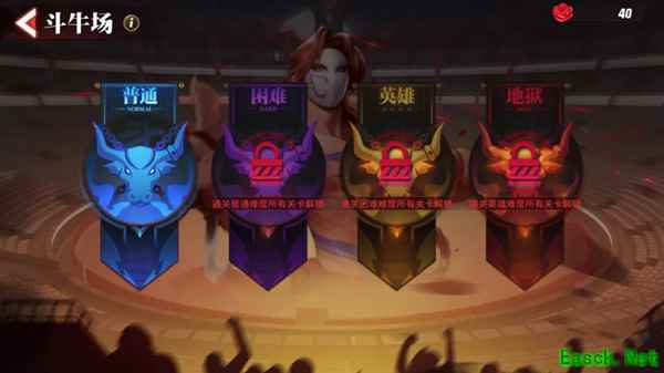 斗牛场挑战赛分为普通、困难、英雄和地狱四个难度,需通关前置难度才会解锁更高级难度。在战斗中,根据格斗家的耗时会获得相应的战斗评分,评分越高,获得的玫瑰越多。