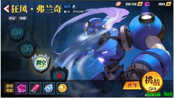 狂风·弗兰奇是一个巨大的人型战争兵器,拥有较为强力的技能。他的挑战难度近似佐伊,但又稍微有一些反击机制,需要大家掌握一定的技巧才能顺利突破。