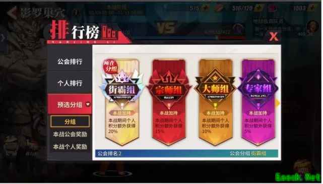 当预选阶段结束后,会按照预选阶段公会积分进行排行,并依据排行结果将公会分配到匹配其实力的组别中。依据排行结果分为街霸组、宗师组、大师组、专家组、格斗组、新秀组。前五个组别在本战阶段会得到更高的个人积分加持。