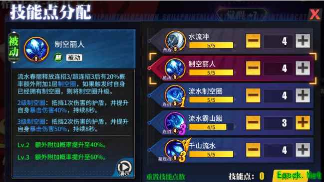 加点分析:流水春丽的技能主要在于被动效果制空圈的作用,制空圈不仅可以提升流水春丽的暴击伤害,还能抵挡伤害,建议主加;而超连招3作为主要输出技能,配合制空圈的效果可以造成更高的伤害,值得副加。