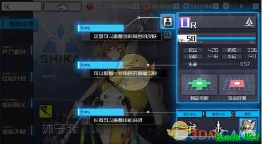 除了生命等信息外,基础属性界面可以查看角色的移动范围和攻击范围,长按技能更可以查看到详细的技能说明。