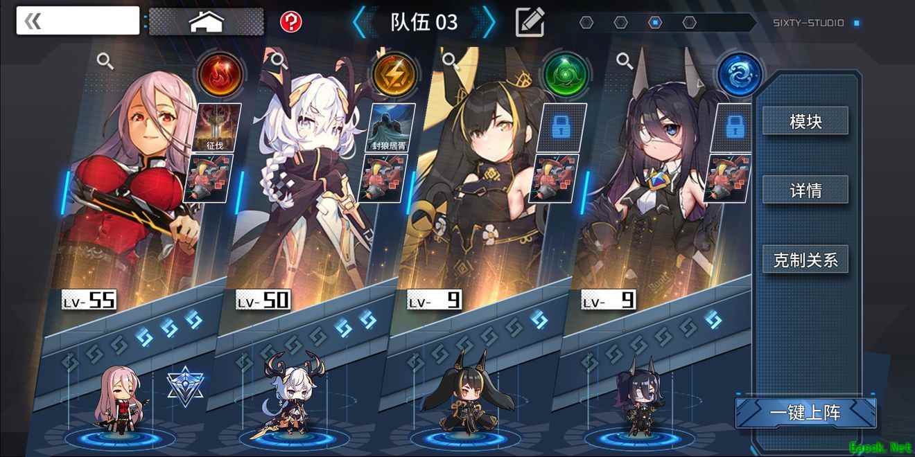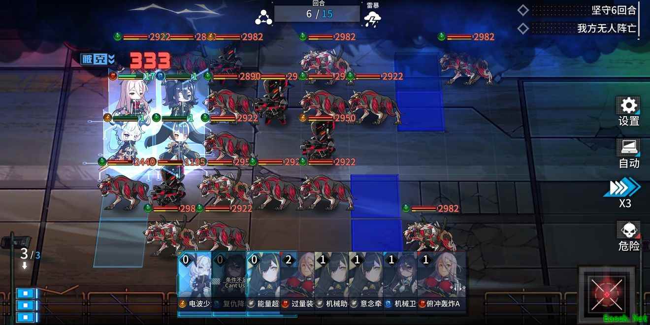 这是正常防守的编队,不需要练度,只要有紫婧或紫雯之一加绝境逆袭(r卡,极易获得,只要别一键分解r卡就行)就可以拖到天荒地老。如果可以的话,多带几个人一起也挺好,加加势力,毕竟势力有属性加成和奖励。