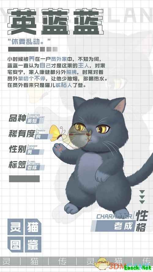 英蓝蓝是灵猫传中的一只猫,很多小伙伴对这只猫都不太了解,那么小编就给大家介绍一下这只猫,下面小编给大家带来《灵猫传》英蓝蓝图鉴一览,还不清楚的小伙伴赶紧来看看吧。