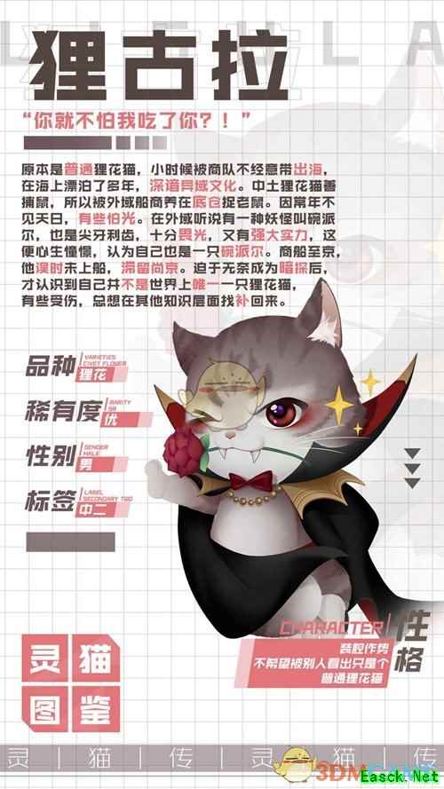 狸古拉是灵猫传中的一只猫,很多小伙伴对这只猫都不太了解,那么小编就给大家介绍一下这只猫,下面小编给大家带来《灵猫传》狸古拉图鉴一览,还不清楚的小伙伴赶紧来看看吧。