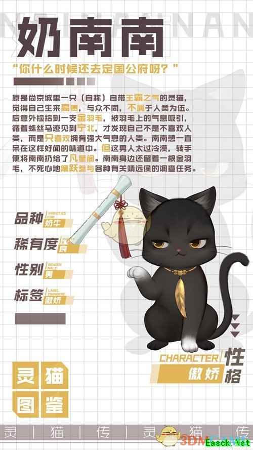 奶南南是灵猫传中的一只猫,很多小伙伴对这只猫都不太了解,那么小编就给大家介绍一下这只猫,下面小编给大家带来《灵猫传》奶南南图鉴一览,还不清楚的小伙伴赶紧来看看吧。