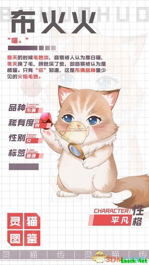 布火火是灵猫传中的一只猫,很多小伙伴对这只猫都不太了解,那么小编就给大家介绍一下这只猫,下面小编给大家带来《灵猫传》布火火图鉴一览,还不清楚的小伙伴赶紧来看看吧。