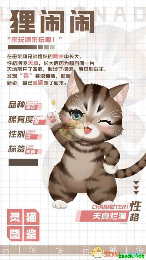 狸闹闹是灵猫传中的一只猫,很多小伙伴对这只猫都不太了解,那么小编就给大家介绍一下这只猫,下面小编给大家带来《灵猫传》狸闹闹图鉴一览,还不清楚的小伙伴赶紧来看看吧。
