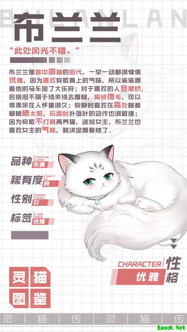 布兰兰是宫中御猫的后代,一举一动都很慵懒优雅,因为喜欢安歌身上的气味,所以偷偷跟着他的马车回了大乐府;对于喜欢的人会撒娇,包括但不限于绕来绕去蹭腿,爱被撸毛,可以乖乖待在人怀里很久;安静时喜欢在高处眯着眼睛晒太阳,玩耍时扑落叶的动作也很敏捷;因为安歌不打算再养猫,送给女主,布兰兰也喜欢女主的气味,就决定跟着她了。