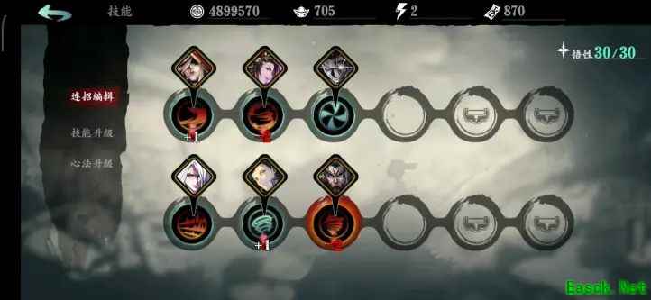 第二排:任意技能(配白剑)+任意技能(可删减)+加杀意技能