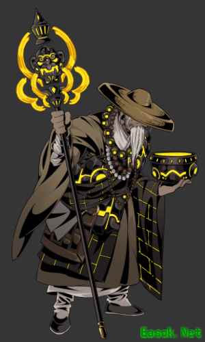 头戴斗笠,手拿禅杖,脖子上有佛珠,另外带着钵盂。几件装备上都有一定的杀意改造。