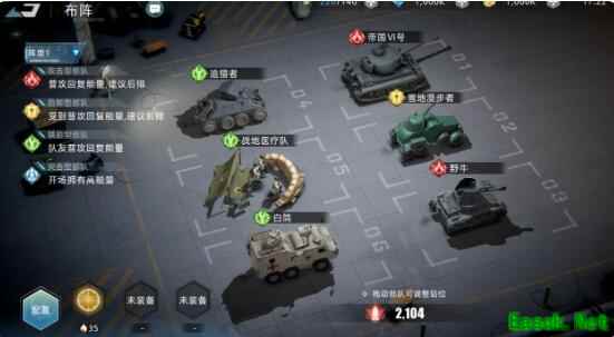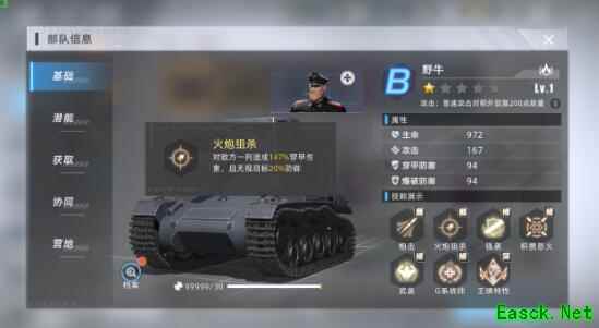 3、野牛坦克属于B级战车里输出能力非常优秀的部队,技能【火炮狙杀】能够对地方造成强大的AOE穿甲伤害,刚好为帝国Ⅵ号做输出策应,甚至会扮演收割者的角色。而它的被动技能【积攒怒火】则是击退回能,为整只队伍留下了逆境翻盘的可能性。