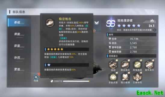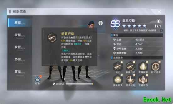 1、本队的核心部队东方雄鹰和皇家空勤属于强搭配组合,列阵协同有无视防御和共同承伤治疗效果。东方雄鹰是整个队伍的输出核心,拥有强大的全体AOE技能,【火力倾泄】不仅造成大量的穿甲伤害,还附带高达50%暴击率和命中率。而皇家空勤则是对地方高伤部队进行双单位打击,【斩首行动】可造成高额爆破伤害,还能附带【熄火】效果。即时能够在它们的打击下生存下来,地方核心位置也很难有效进行输出。
