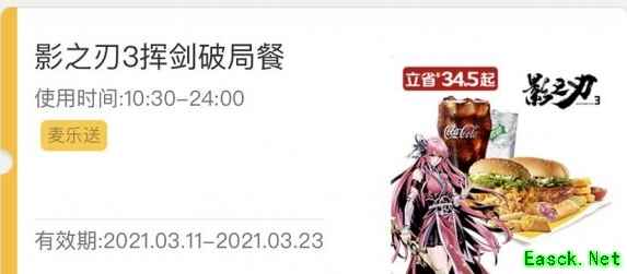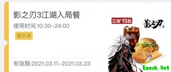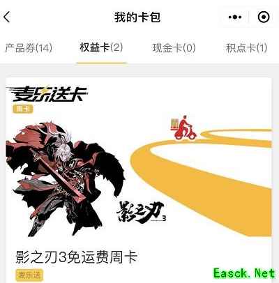 领取影之刃3主题免运费周卡,即可享受麦乐送每天2次免外送费的福利,有效期自领取之日起7日内有效~