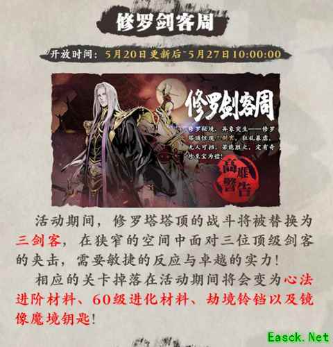 活动期间,修罗塔塔顶的战斗将被替换为三剑客,在狭窄的空间中面对三位顶级剑客的夹击,需要敏捷的反应与卓越的实力!相应的关卡掉落在活动期间将会变为心法进阶材料、60级进化材料、劫境铃铛以及镜像魔境钥匙!