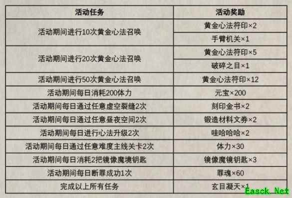 活动期间,通过完成以下任务即可在限时活动中免费领取稀有奖励,最高可获得“玄目凝天”心法1张。
