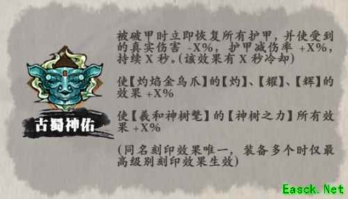 2、古蜀神佑刻印的效果比较强,当玩家角色被破甲的时候,可以马上恢复所有的护甲,而且还可以让玩家受到的真实伤害减少10%,护甲减伤率增加3%,这个效果可以持续3秒,不过有20秒的冷却。