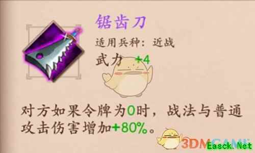 锯齿刀是策魂三国中的宝物之一,很多小伙伴对于这个宝物的属性技能不太了解,那么小编就给大家介绍一下这个宝物,下面小编给大家带来《策魂三国》锯齿刀属性技能图鉴一览,还不清楚的小伙伴赶紧来看看吧。
