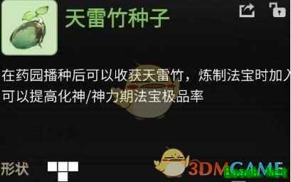 其中天雷竹种子种植获得的“万年天雷竹”比较珍贵,用于锻造装备和法宝时增加高品质概率,天机阁内卖150机缘一个,可以多买点来种。