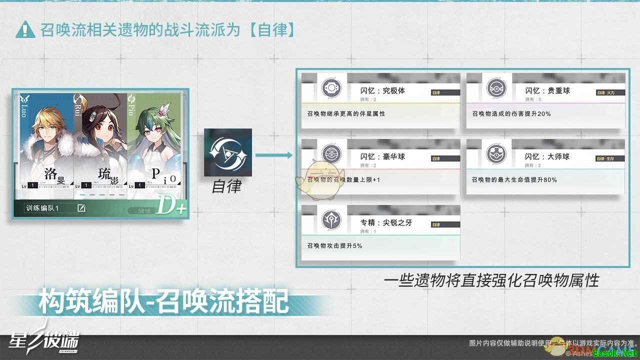 这里是一组拥有召唤类技能以及对应遗物的训练编队,该编队将通过召唤不同类型的召唤物辅助伴星作战,并且编队当中的遗物也会极大地提升召唤物的属性