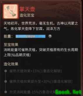 基础的能量消耗效果为:每消耗1点能量催熟灵植一小时。而1重造化后可以提升15%催熟速率,3重造化后可以提升30%催熟速率。