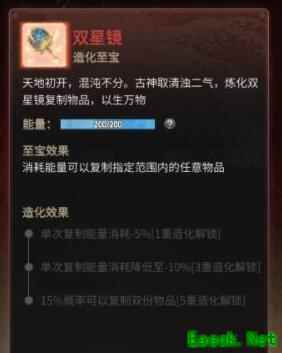 该至宝的效果正与能量消耗的效果相似,修士们可以复制多种炼器辅材和各类丹药,这相当于各种珍宝可以获得2份。许多功能需要消耗一定数量的珍宝,这时候双星镜的功效便发挥了作用。